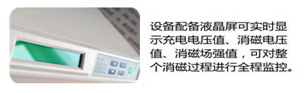 设备内置电压监测仪,充电时,电压监测实时探测充电电压值,该值出厂前经过校准,误差率小于1%,由于充电电压值的高低直接影响到消磁场强的强度,因此,必须对充电电压进行监控,确保充电电压值达到一定高度。